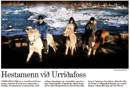 "Der Urridafoss (foss = Wasserfall) im Fluß Thorsá ist beliebt bei Pferdefreunden, zumal er einer der wasserreichsten im Lande ist. Der Wasserfall war in der letzten Zeit besonders ansehnlich und wasserreich wegen der Schneeschmelze, verursacht durch die Wärme der vergangenen Wochen. Als der Fotograf des Morgenblattes vorbei kam, traf er Christiane Grossklaus, wohnhaft auf Egilstadir I im Landkreis Villingaholtshreppur und zwei ihrer Gäste, Sabine Hornung und Lea Ritter."
