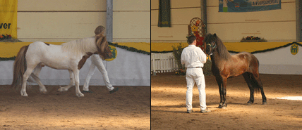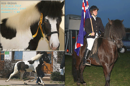 Wir sind sehr stolz auf unseren jungen Hengst (wird Ende Juli erst 3), der sich super an der Hand von Miriam Jonasson präsentiert hat, wenn man bedenkt, dass er erst vor 6 Wochen von Tanja Engel halfterführig gemacht wurde... Er hat sehr schnell gelernt und hat einen super Charakter bewiesen! Natürlich sind wir auf seine diesjährigen Fohlen schon sehr gespannt. Blá-Skjoni hat 2006 2 Probesprünge absolviert.