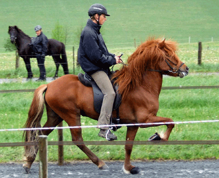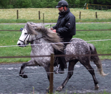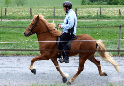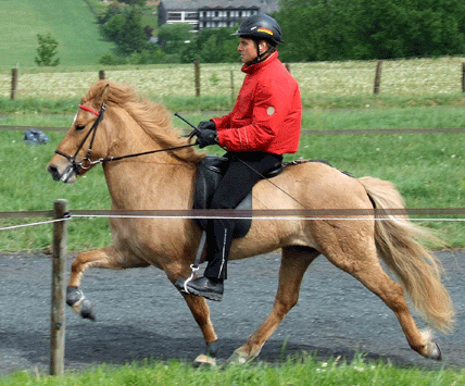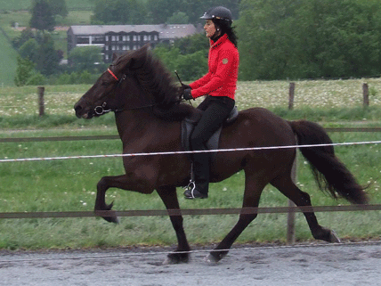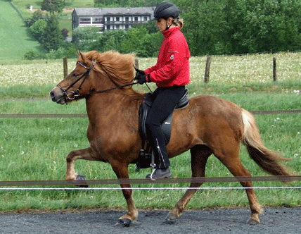 Dínus vom Lindenhof, Jahrgang 2002, Vater ist Gustur frá Grund, die Mutter ist Drottning vom Lindenhof, eine Galsi-Tochter. Dínus zeigte Tölt in "freier Haltung" und bis ins hohe Tempo und erhielt eine 9,0 dafür.