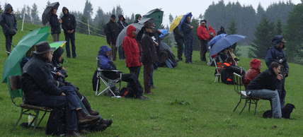 Die in den zurückliegenden Aprilwochen vermissten Regenfälle schienen gestern im Hochsauerland nieder zu gehen. Richter und Zuschauer schützten sich mit Regenschirmen und Decken gegen die Nässe und Kühle.