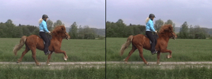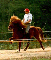sich die folgende Bodenarbeit als reinste Freude herausstellen sollte. Da Palfi sehr schnell lernt und eine erstaunlich gute Auffassungsgabe besitzt, machte er auch bei den folgenden Lektionen des Einreitens willig mit. Das Eintölten erwies sich bei ihm - da er als Jungpferd keinen Tölt zeigte und auch sonst sehr an seiner Lieblingsgangart Trab hing - als etwas kniffelig, wobei er nach 2,5 Monaten konsequentem Üben auf einmal taktklaren Tölt zeigte und er nun sogar den Tölt zu seiner neuen Lieblingsgangart erkoren hat!