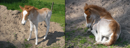 das zweite Mooshof-Fohlen 2006 vor: "Diesmal ist es ein großer Fuchs oder Fuchsfalbhengst mit großer Blesse und allen fünf Gängen. Geboren wurde er am 05.05. Sein Vater ist wieder Klakkur frá Sauðárkroki und seine Mutter ist die Maja vom Odinshof. Besitzer ist der Mooshof. Weitere Bilder von den Zwergen gibt es unter