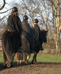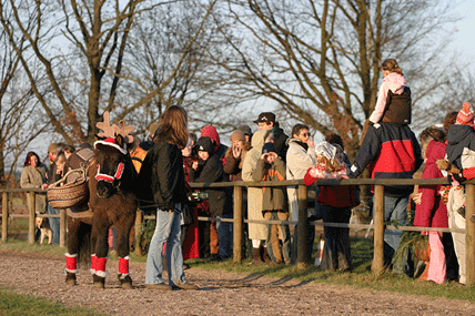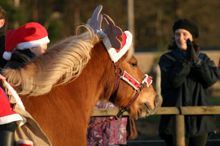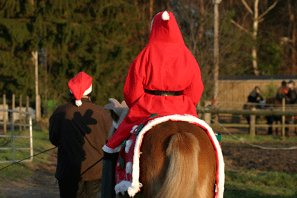 Am zweiten Adventssonntag wurde zu einem schaurig schönen Besuch in "Schanzelvanien" geladen. Auf dem, im weihnachtlichen Glanz erstrahlenden Schanzenhof, von Familie Naujokat/Zufall, fand eine Weihnachtsfeier der ganz besonderen Art statt; Elf Mädchen hatten sich zusammen getan und schon seit Wochen "Rüdiger, der kleine Vampir" als gerittenes Theaterstück, mit dem Höhepunkt einer Quadrille, geübt. In jeder freien Mintue wurde geprobt, die Kostüme genäht und darüber hinaus gemeinsam "Knoblauch"-Kekse gebacken, die den Zuschauern, zur Überbrückung einer Umbaupause, von zwei kleinen Hilfsvampiren, gereicht wurden. Zwei Isis im Elchkostüm halfen beim Verteilen. Mit ihren Geweihen, den roten Mützen, den roten Gamaschen und den mit Keksen gefüllten Packkörben sahen sie einfach hinreißend aus. Bei jedem Schritt klingelten kleine Glöckchen.