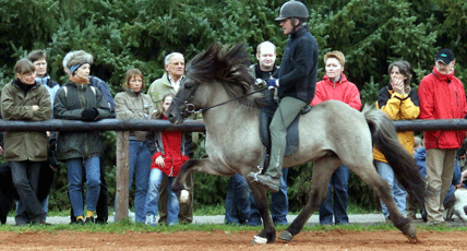 Highlight der Veranstaltung der Auftritt des aus Dänemark angereisten mehrfachen Weltmeisters Johann R. Skulason mit Hvinur. Der Zuschauer durfte dem Meisterpaar beim Tölttrainig zuschauen. Eine beeindruckende Vorstellung.