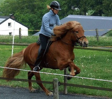 Dínus vom Lindenhof, Jahrgang 2002, Vater ist Gustur frá Grund, die Mutter ist Drottning vom Lindenhof, eine Galsi-Tochter. Dínus zeigte Tölt in "freier Haltung" und bis ins hohe Tempo und erhielt eine 9,0 dafür.