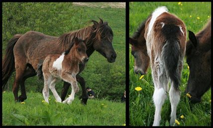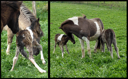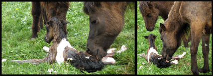 Jetzt stehe ich da, ich kleiner Pferdebub und Tante Sunna kümmert sich um mich, damit Mama sich noch etwas ausruhen kann. Das ist nicht in allen Herden so, hab ich mir sagen lassen, aber bei uns wird größter Wert auf gutes Sozialverhalten gelegt (re. Foto).