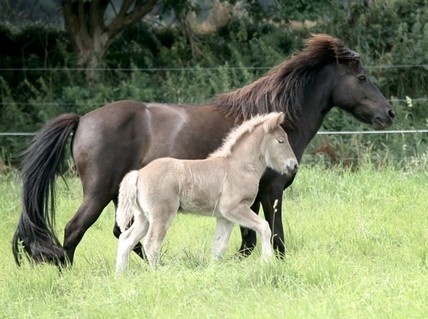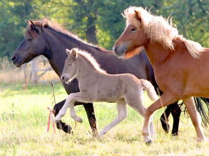 "Anbei senden wir Fotos von unserem Hengstfohlen Fjalar , er  wurde am 25.07. 2013 geboren. Die Mutter ist Rose vom Wiesenhof (eine Gjafar Tochter aus einer Nattfari vom Wiesenhof Mutter) der Vater ist Djakni vom Kronshof.  Fjalar zeigt eine tolle Aufrichtung und ebenso gute Gänge. Auf die endgültige Farbe sind wir sehr gespannt."
