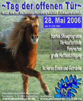 Zu einem Tag der offenen Tür lädt der Islandpferdehof Olgemöller (Claudia Olgemöller, Schirl 46, 48346 Ostbevern) zu Christi Himmelfahrt, am kommenden Donnerstag (25. Mai) ein. Die Veranstaltung beginnt um 13 Uhr und auf dem Programm stehen u.a. Vorführungen der Reitschulgruppen, eine Hengstpräsentation und Ponyreiten. Daneben gibt es die Möglichkeit, sich an Verkaufsständen umzusehen und die Besucher dürfen sich auf Kaffee und Kuchen freuen.