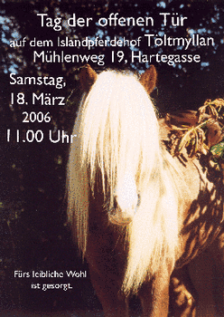 Am Samstag, den 18. März, findet dort ab 11 Uhr ein Tag der offenen Tür statt. Auf dem Programm stehen unter anderem eine Verkaufspferde- und Hengstschau. Zu sehen sein werden dabei z.B. die Hengste Nagli frá Þúfu, Hrafn vom Schloßberg, Helmingur vom Schloßberg und Djáknar frá Hvammi. Auch für das leibliche Wohl wird natürlich gesorgt sein.