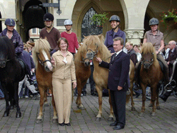 Den Islandpferden und ihren Reitern aus dem Münsterland kam heute (Donnerstag, 11. August) die ehrenvolle Aufgabe zu, die Aktion "Pferde-Stärken 2005" in Münster zu eröffnen. Unerschrocken marschierten die Isis vom Domplatz über den Prinzipalmarkt zum Rathaus, wo sie von Münsters Oberbürgermeister Dr. Berthold Tillmann und vielen kleinen und großen Zuschauern begrüßt wurden. Sehen Sie sich hier die