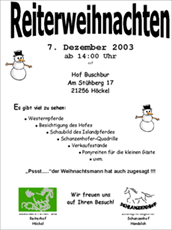 Der Schanzenhof und der Hof Buschbur veranstalten zusammen am 7. Dezember 2003 Reiterweihnachten. Die Veranstaltung findet statt auf dem Hof Buschbur, Am Stühberg 17, 21256 Höckel und beginnt um 14 Uhr. Ein vielseitiges Programm erwartet die Gäste: So gibt es laut Veranstalter Westernpferde, ein Schaubild des Islandpferdes, die Schanzenhofer-Quadrille, Verkaufsstände u.v.m. zu sehen. Zudem kann der Hof Buschbur besichtigt werden und für die Kleinen gibt es Ponyreiten. Übrigens: Die Reiterweihnacht wird im Trockenen, nämlich in der Reithalle des Hofes Buschbur, gefeiert. Klicken Sie