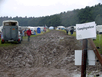 | Obwohl es tagelang regnete und daher auch das Rahmenprogramm zum größten Teil ausfallen musste, ließen sich Teilnehmer und Veranstalter der DJIM 2002 nicht die gute Laune verderben. Teilweise mussten die Kinder, Jugendlichen und Junioren vom Campingplatz in nahegelegene Turnhallen umziehen. Die Oval- und Passbahn jedoch hielten der Witterung stand, so dass hervorragende Leistungen geboten wurden... |  |